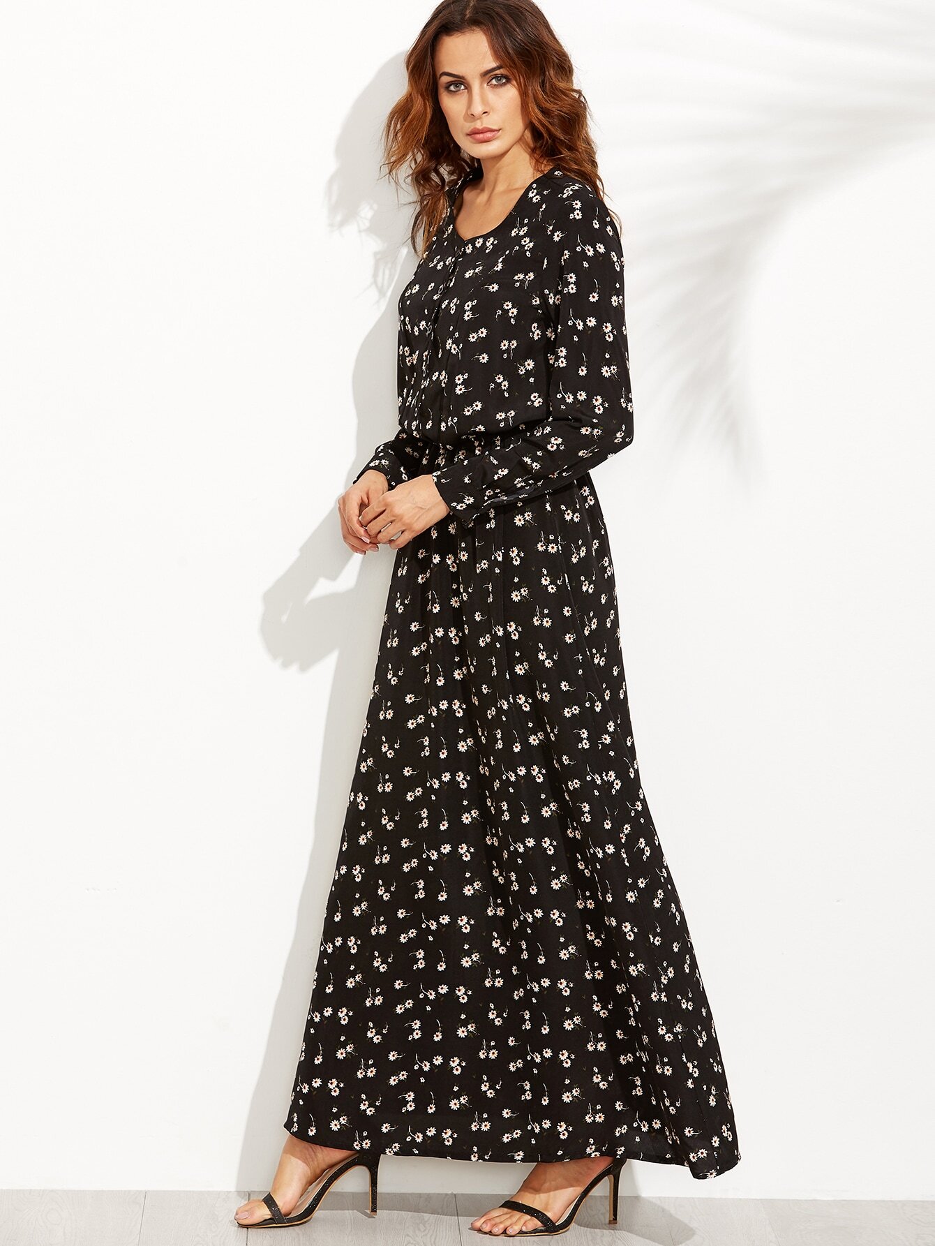 Black Daisy Print Button Front Shirt Dress Discounted at only: US$ 25.99