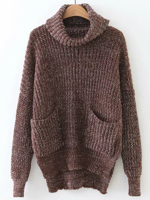 Coffee Turtleneck High Low Sweater With Pocket Discounted at only: US$ 20.99